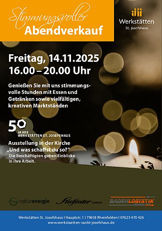 Der Stimmungsvolle Abendverkauf erfreut sich großer Beliebtheit und bietet die Gelegenheit Bekannte zu treffen, sich zu unterhalten und bei vorweihnachtlicher Stimmung vielleicht bei dem einen oder anderen Angebot zuzugreifen. Die Werkstätten St. Josefshaus sowie ihre Kooperationspartner, zu denen auch örtliche Vereine gehören, freuen sich, wieder zum Stimmungsvollen Abendverkauf einladen zu können.